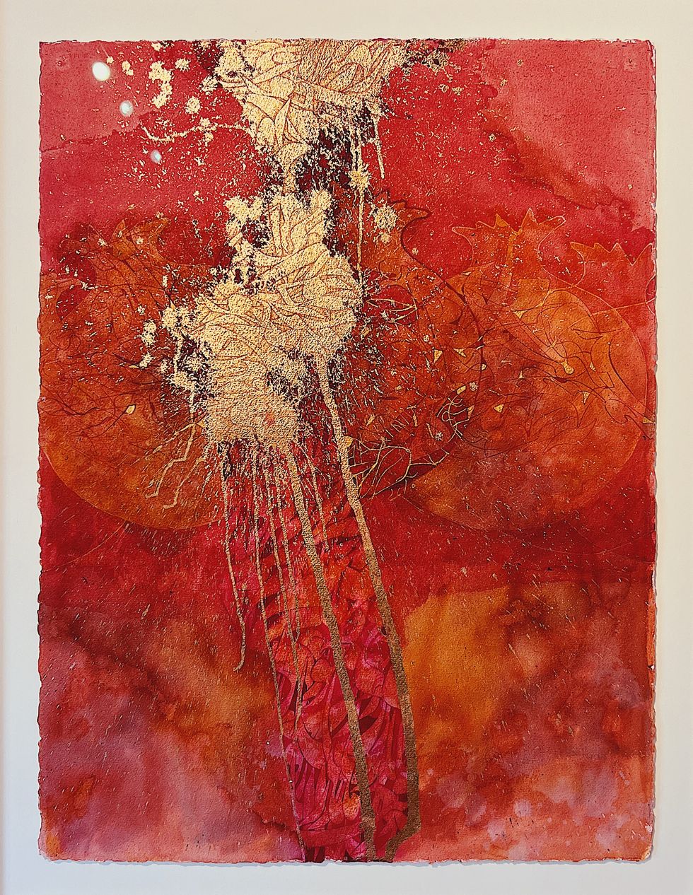 One of the most striking pieces in the show by Awrang is “Pomegranate Blood,” which infuses the mediums of acrylic paint with watercolors and gold leaf to create an arresting blend of fiery colors and ornate textures woven into the paint like a poem. As the master calligrapher wrote in the show notes, “Kandahar [an Afghan city on the Arghandab River] is one the provinces of Afghanistan where pomegranates are famous for their sweetness. It is a time of celebration. When I was in Kabul, we had pomegranate parties every year at the house of a dear friend. For this reason, I see the pomegranate as the heart of all and it is blood sugar.”