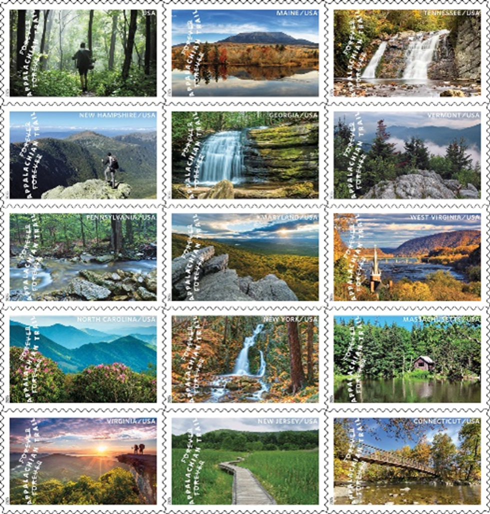 On Feb. 28, the U.S. Postal Service unveiled a pane of 15 forever stamps depicting images taken along the trail in each of the 14 states it traverses, plus one general scene, to commemorate its 100th anniversary.