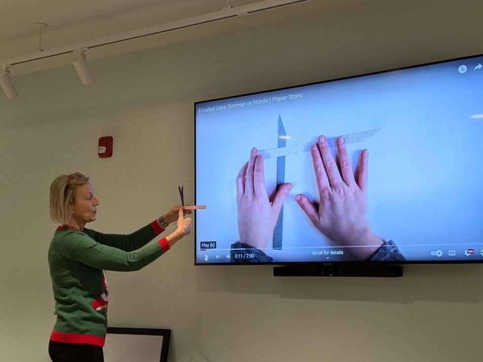 The Froebel Christmas Star, however, is no children’s feat. The four strips of paper require a shockingly high level of preciseness in order to reach the finished product, and while the first few steps may give the impression of an easy craft, the star proved a significant challenge for those in attendance who represented a wide variety of ages. Many of the steps are more akin to weaving than they are to folding. Instructor Anne Cameron spent multiple weeks practicing herself in order to prepare.