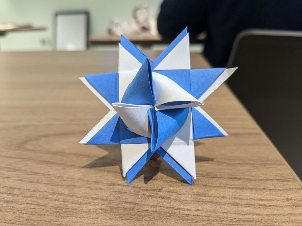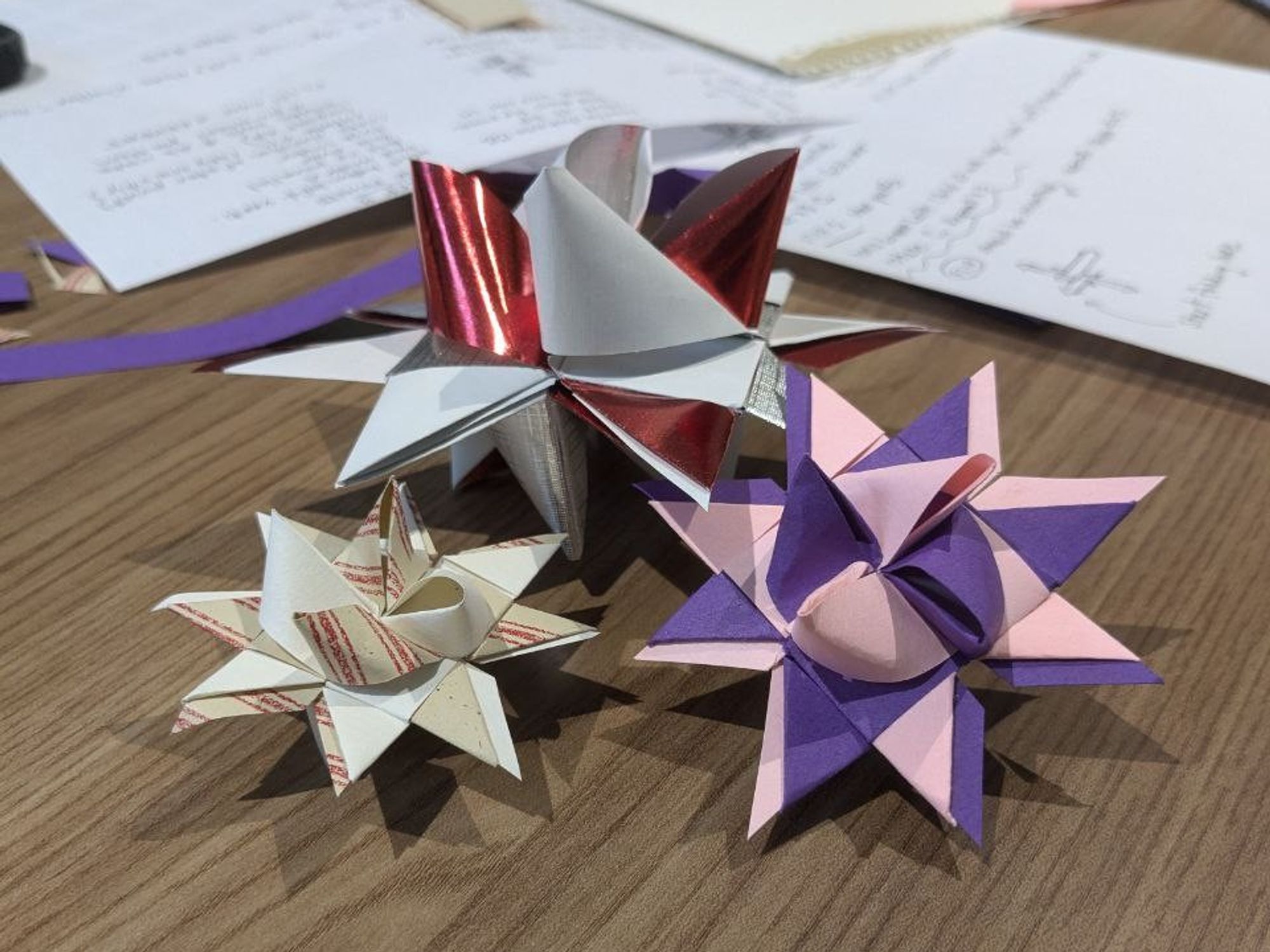 On the day of the workshop, Cameron used a video as an assistant, slowly going through step by step and checking in on each table. Soon, as the project reached its more complex stages, Cameron went from table to table and back again going over many of the specific rules on exactly how to fold the stars. Despite the difficulty, participants kept a determined outlook. After many attempts, do-overs and backtracking, attendees eventually finished their first star.