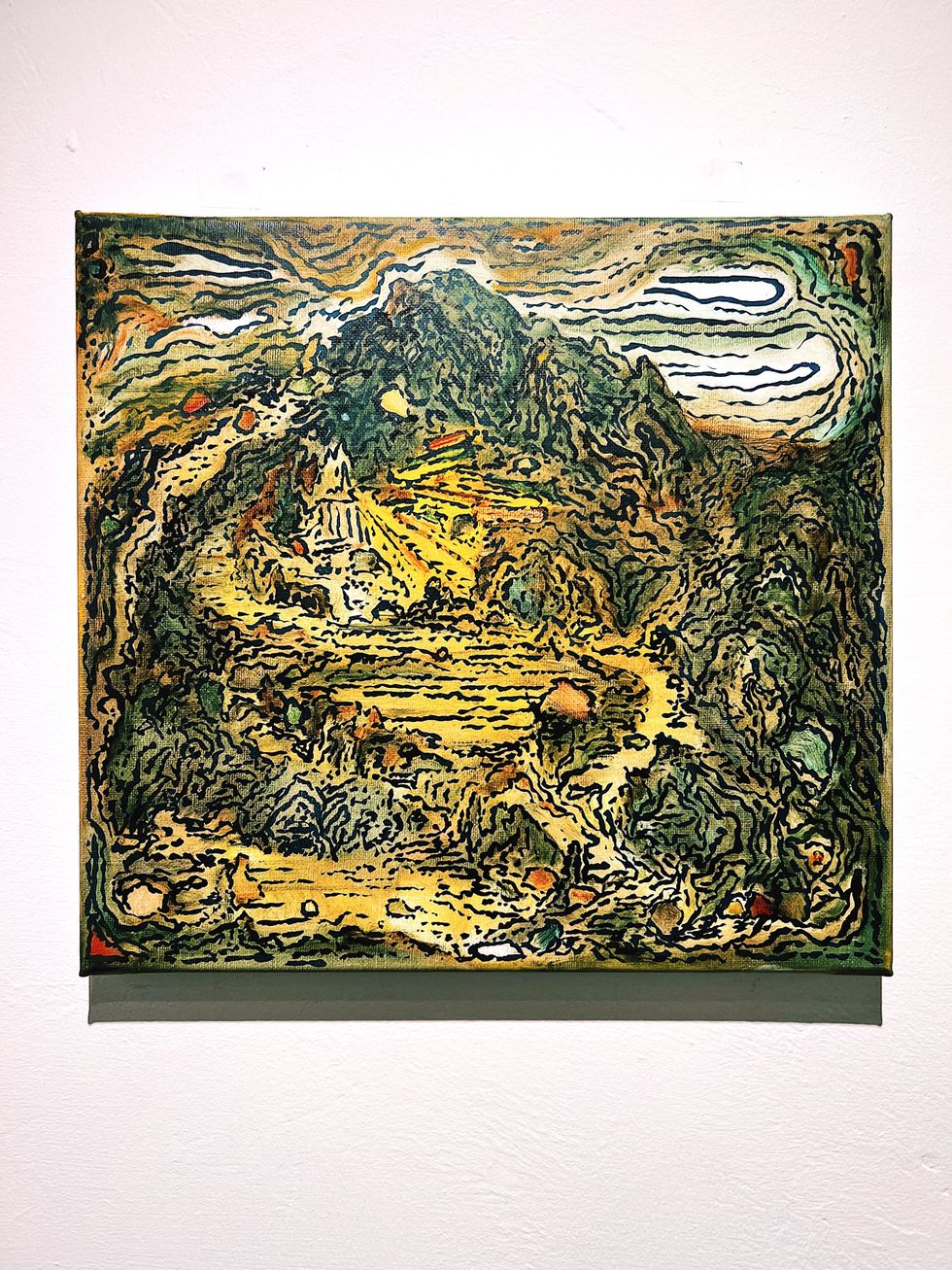 On view in Furnace's Vaulted Project Space are the graphic ink point landscapes by Jimbo Blachly, who finds arbor inspiration in Inwood Hill Park in Upper Manhattan, just above The Met Cloisters. His other series, prismatic works on linen canvases, with washes of oil paint colors, take on the mountainous, mysterious traits of fantasyland illustration — the swirling clouds and looming woods the mind might conjure reading Tolkien’s “The Hobbit.”