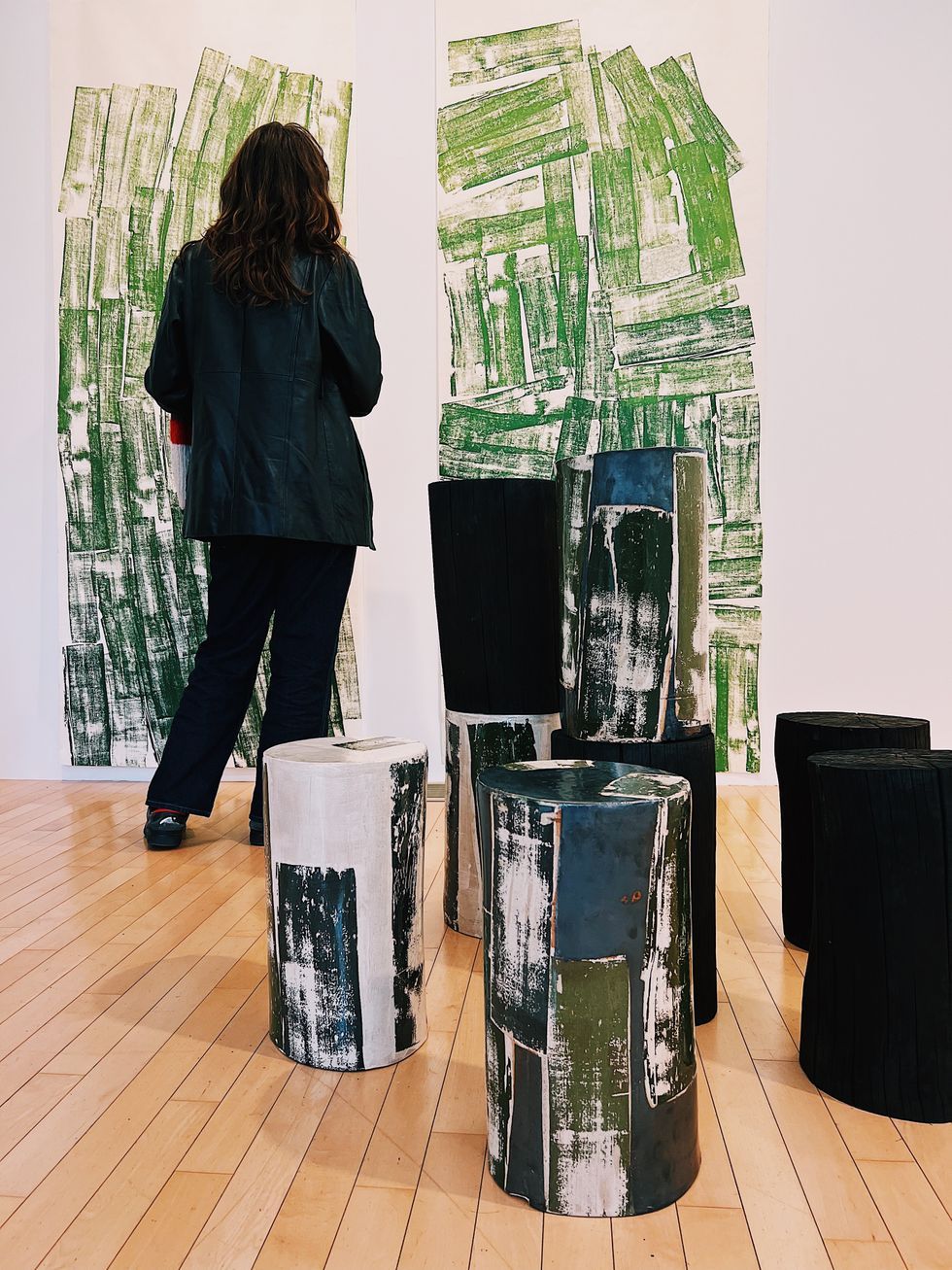 The sleek white space of Furnace - Art on Paper Archive in Falls Village, Conn., is now striped in verdant swipes of paint as “Cut to Length” opened last weekend, featuring Janis Stemmermann’s viridescent prints. The series by the Brooklyn-based artist, which blends rich broad strokes of green — from the warm hue of an avocado skin to sea glass emerald to a chilly British racing shade — takes printmaking from the flat surface of the canvas to three-dimensional ceramics. Her sculpted objects printed in the signature stripe are installed with heavy wooden stumps, showcasing both their strength and delicacy, and creating a little forest that gallery-goers wove through at the opening reception.