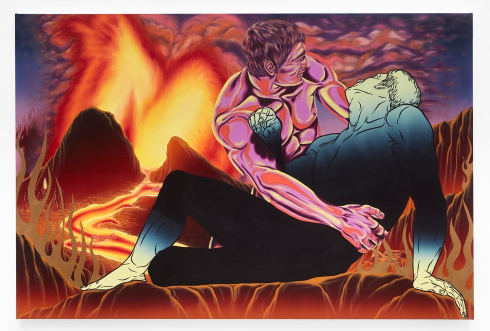 Paul Anagnostopoulos’s striking paintings blend the homoerotic heroism of Mary Renault’s novels of Ancient Greece with the Abercrombie & Fitch-era photography of Bruce Weber and the colors of a Day-Glo disco sunset on a Donna Summer vinyl.