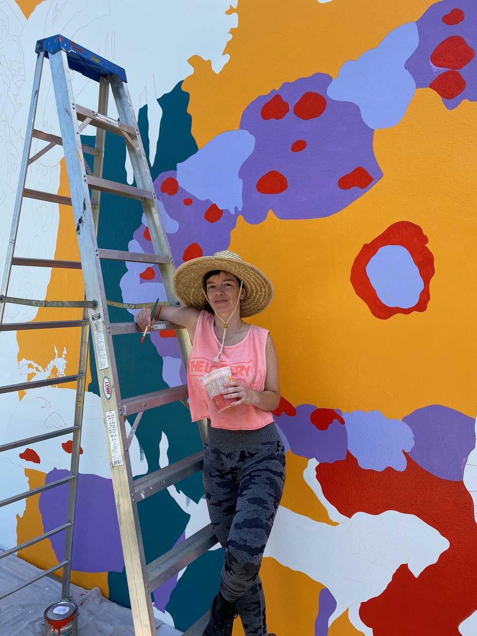 Blair expected that the weather-dependent project would take two more weeks to complete. The work began with a projected image on the wall to set the design. She uses exterior, semi-gloss acrylic paint, chosen for its resistance to the elements.