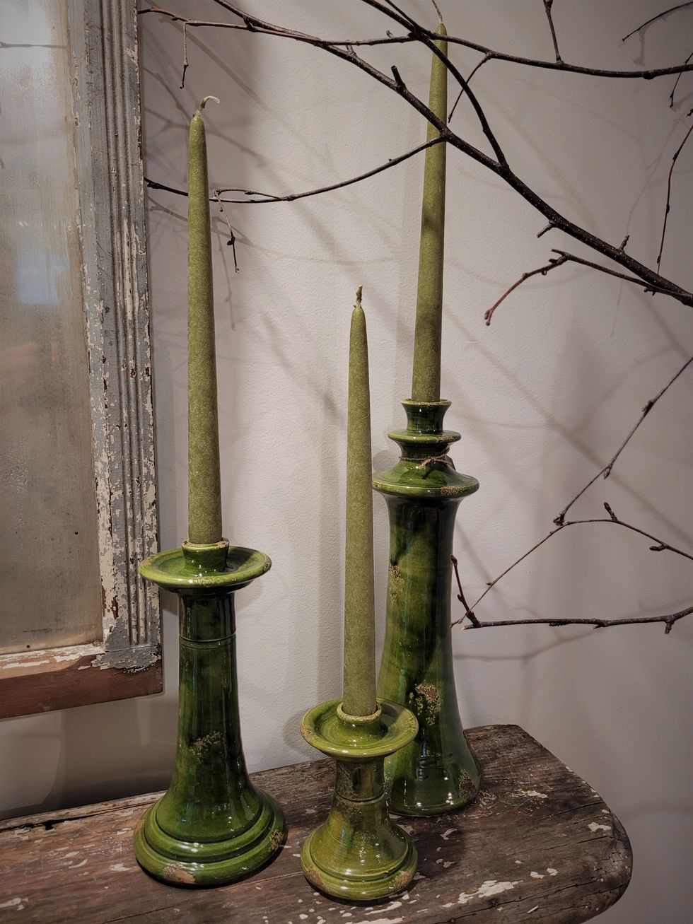 A trio of green candlestick holders at Honeychurch Home add a natural earthiness to their surroundings. Photo by Debra A. Aleksinas