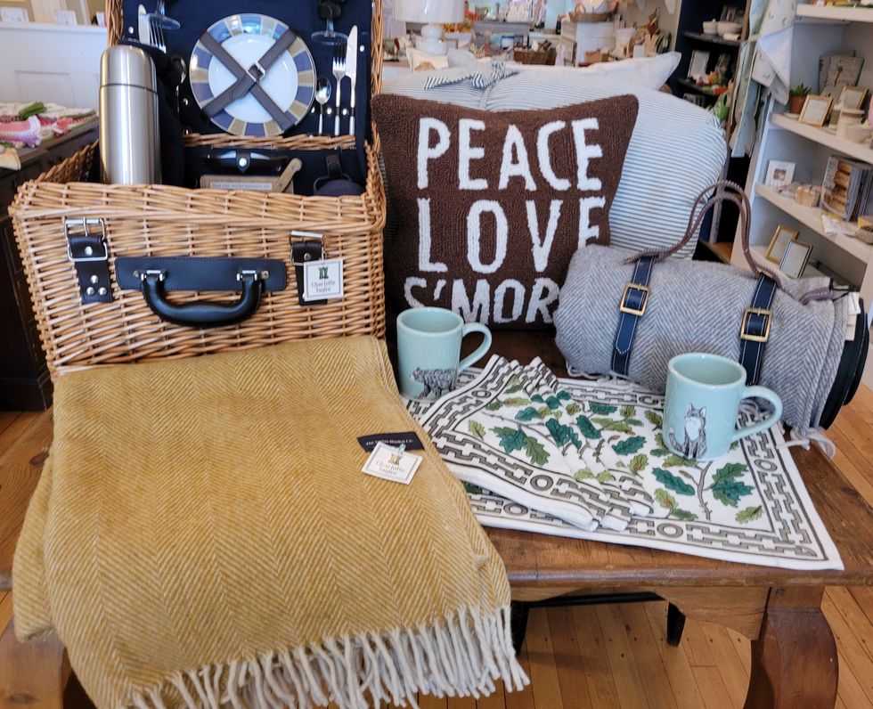 Fuss said in response to demand from many of her customers who enjoy walks among the fall foliage, the store also offers several items with take-out comfort, like a fully stocked picnic basket and a wool and wax picnic blanket all rolled up and ready for outdoor occupancy.