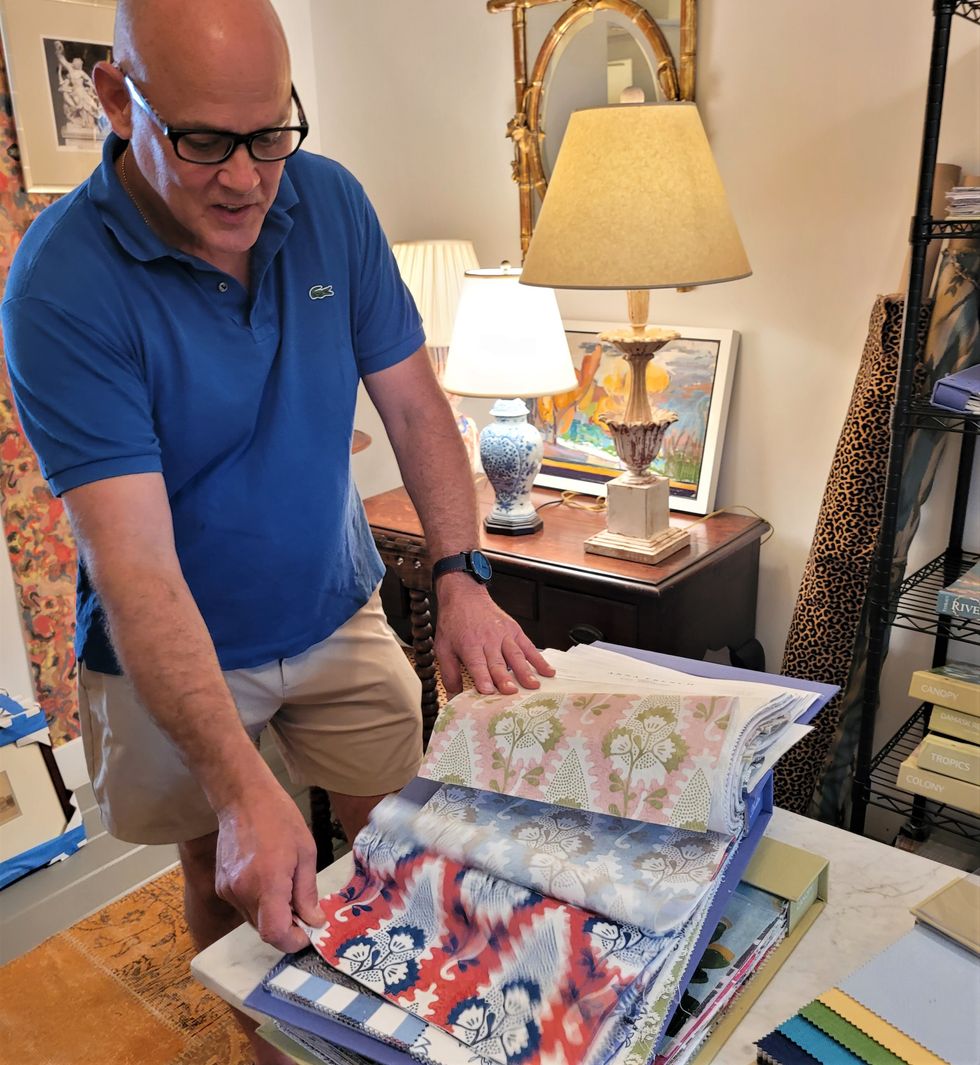 Todd Page, owner of Millerton Redux, selects a fabric upholstery pattern befitting the season. Photo by Debra A. Aleksinas