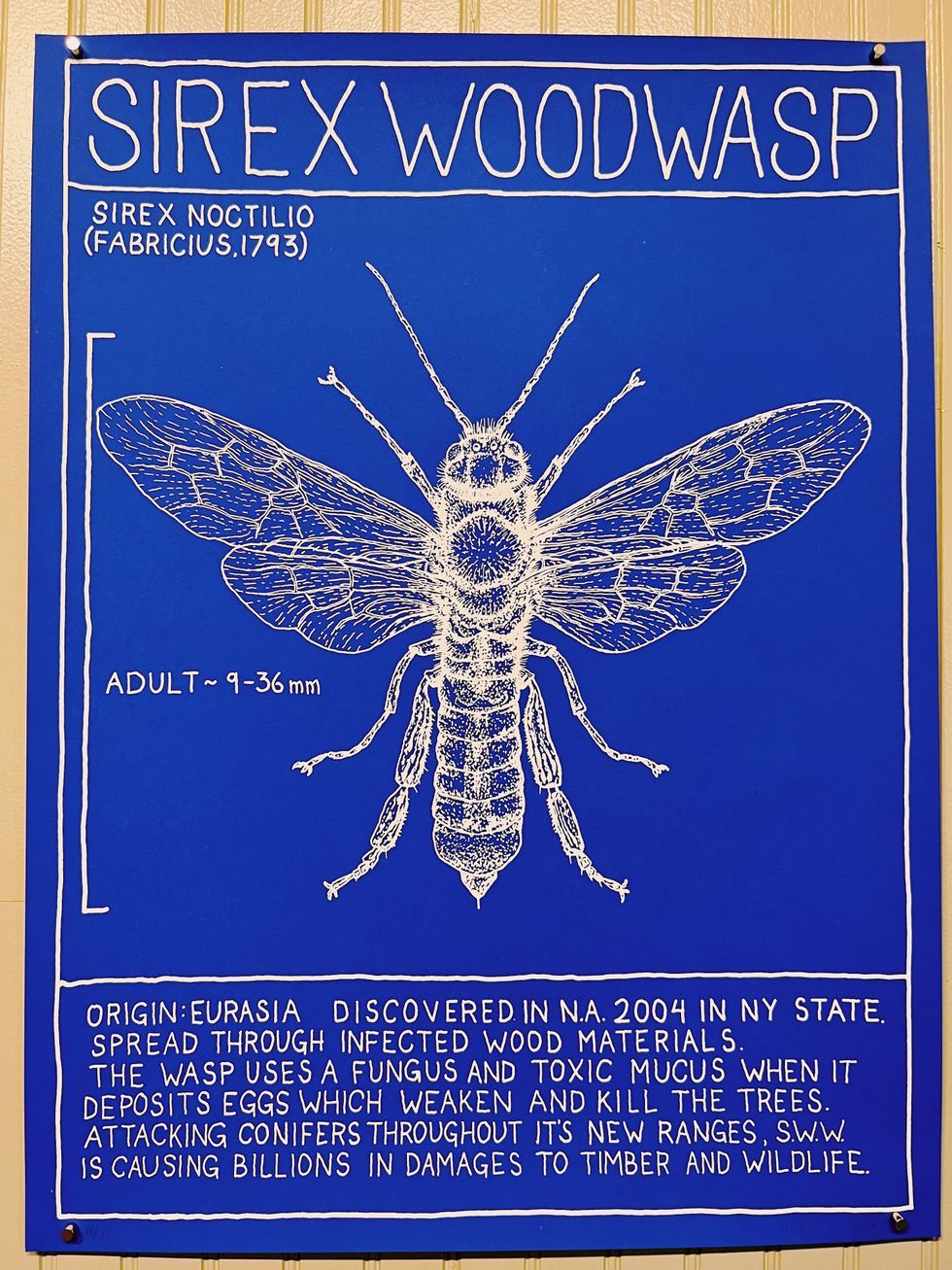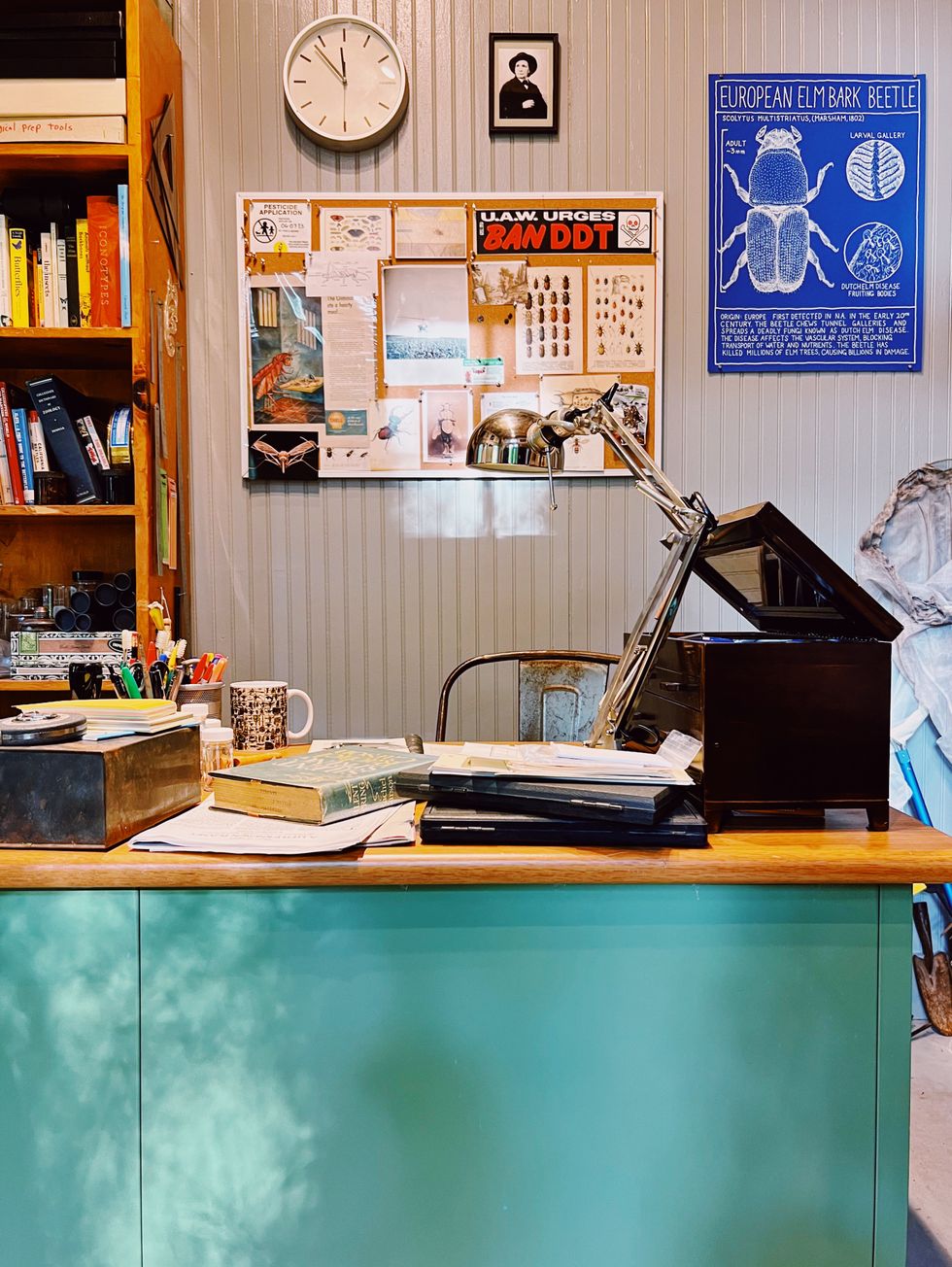 Curated by Richard Klein with support from The O’Grady Foundation, an independent private foundation established in Connecticut by Thomas and Kathleen O’Grady, and The Sharon Land Trust, Dion’s “Field Station for the Melancholy Entomologist” sees the cheeky cultural observer once again examining the mix of clinical study and scientific chaos. This is man’s academic mind meets the unwieldy natural world. Tattered hardbacks on nymphs, beetles, katydids, and crickets line a bookshelf that also houses several orange pharmaceutical tubes — a prescription for minocycline made out to Dion, used to treat skin infections. Brown glass chemical jars clutter the office table tops and brilliant cobalt blue posters are illustrated with the features of the Sirex woodwasp and the hemlock wooly adelgid, both pesky invasive species harmful to North American trees.