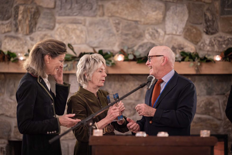 LJMN Media Board Chair Dan Dwyer, right, presents the 2025 Estabrook Community Leadership award to Bunny Williams, center, for her contribution to regional community organizations. Betsy Smith, left, chaired the Jubilee host committee.