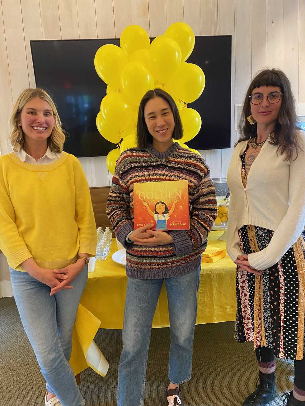Eva Chen, center, read aloud her book, “I Am Golden,” at the Cornwall Library. Eiseley Kotchoubey of Cornwall is at left in the photo; at right is Samantha Saliter of Sharon’s library.