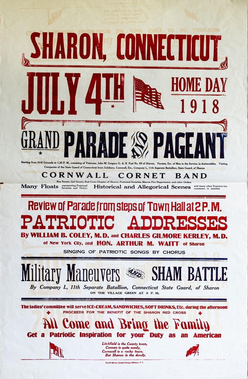 “We discovered posters from World War I, World War II, several National Children’s Book Week posters from the 1940s to 1961, proclamations from the State of Connecticut, some remarkable Connecticut-specific posters from World War II, and an incredible poster announcing the Fourth of July festivities on the Sharon Green in 1918, months before the end of World War I.”