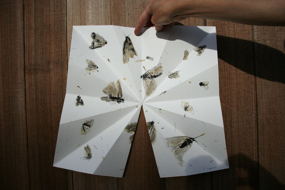 Through the years Orzano has added layers to the work, often literally so, by folding the paper and by also inserting canvas into the hive. The bees like it; they use the canvas for their own renovation projects, just as they do with the paper. Sometimes the images that Orzano slips into the hives are of the bees themselves. Sometimes they depict plants. Sometimes they’re large and portrait-like, sometimes they’re small and pattern-like.