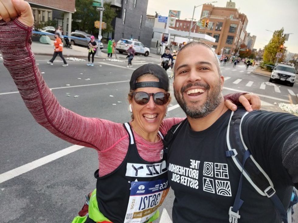 Elizabeth England (of Cornwall and Manhattan) walked the New York City Marathon as a member of a team raising funds for Brotherhood Sister Sol in New York City. At the halfway mark, she stopped for a selfie with the organization’s development director, John Anthony Dumey. Photo courtesy Elizabeth England