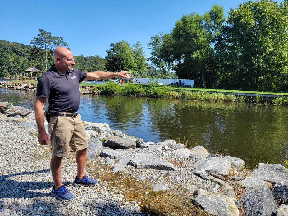Bob Petzold, owner of the Chester Boat Basin on the Connecticut River, points to an area clogged with thick mats of hydrilla prior to a test application of an aquatic herbicide by the U.S. Army Corps of Engineers this summer. Two of his marinas are among five demonstration sites in the Connecticut River Watershed selected for hydrilla research.Photo by Debra A. Aleksinas