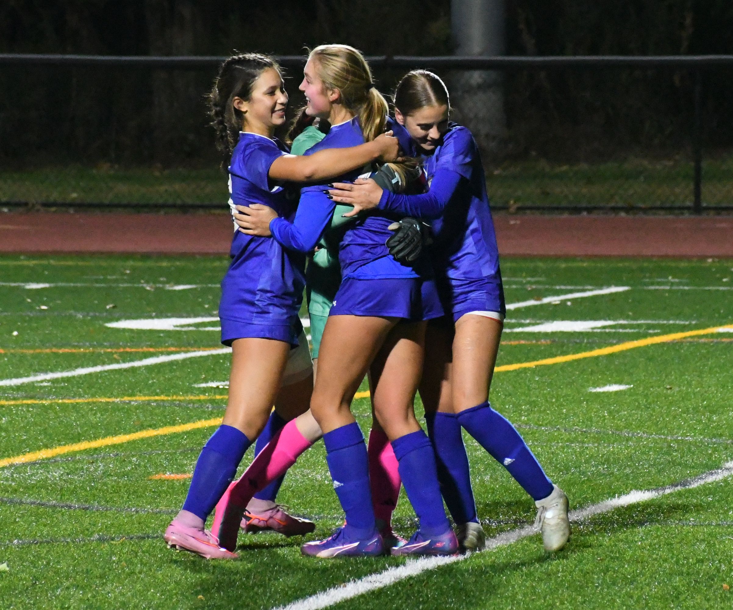 The Nonnewaug girls team celebrates as victors in the Berkshire League tournament final Oct. 28.Photo by Riley Klein