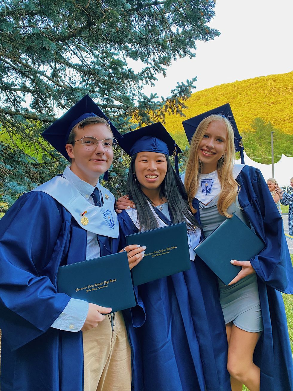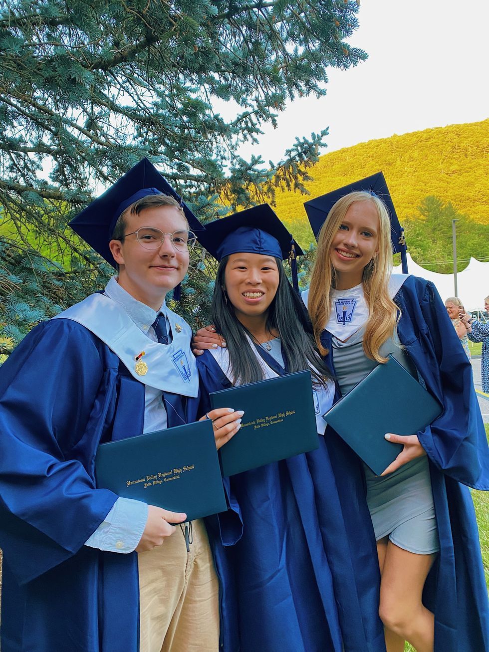 HVRHS Class of 2021 essayist Emerson Rinehart, left, with class salutatorian Mia Tittmann, center, and valedictorian Charlotte Clulow. Photo by Alexander Wilburn