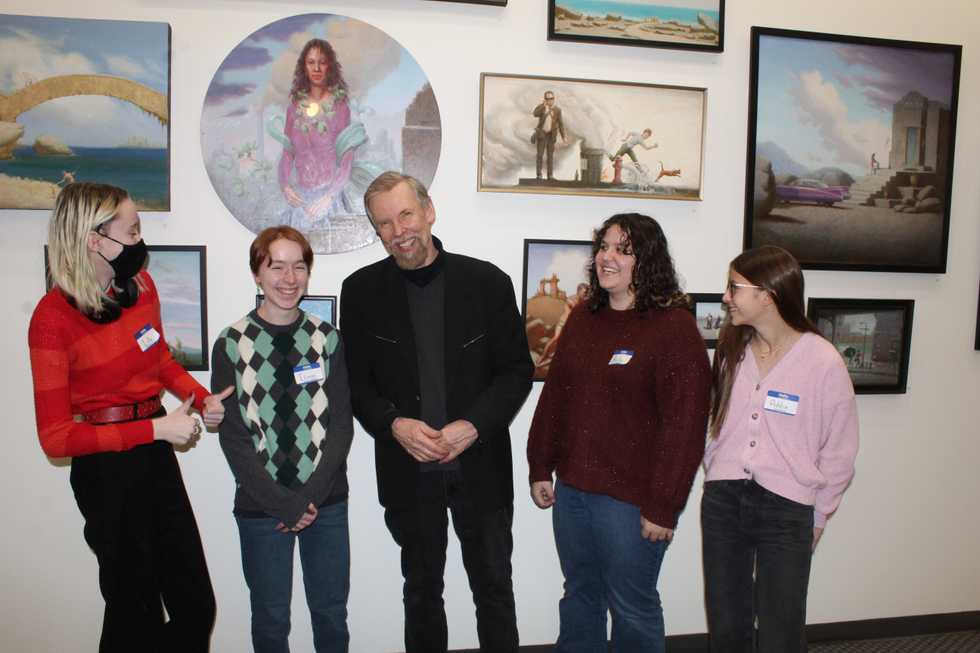Students helped with the setup of the Warren Prindle retrospective art show at Housatonic Valley Regional High School. From left, Lilly MacMillan, Elinor Wolgemuth, Prindle, Birdie Boyden, and Addie Diorio.