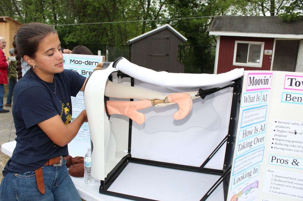 The phrase “semen gun” was prominent on Hayden Bachman’s display. The sophomore from Falls Village said she and several classmates, plus HVRHS teacher Rene Boardman, recently gained certification in artificially inseminating cows.