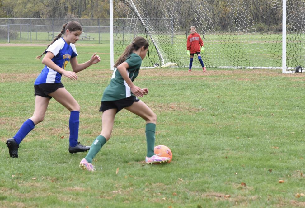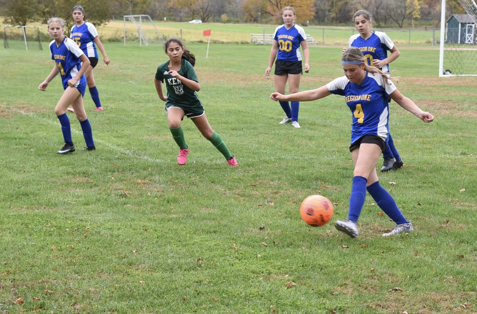 Kent Center School defeated the Region One middle school girls soccer team Monday, Oct. 20. Although showers paused for the game, cold winds relented. Kent scored 15 minutes into the first half and again moments later. The first half was about to end when Kent made it a 3-0 game. The Region One team, consisting of players from Lee H. Kellogg School, North Canaan Elementary School, Cornwall Consolidated School, Sharon Center School and Salisbury Central School, got on the board with only a minute left. The second half saw Kent score again for a 4-1 final score.