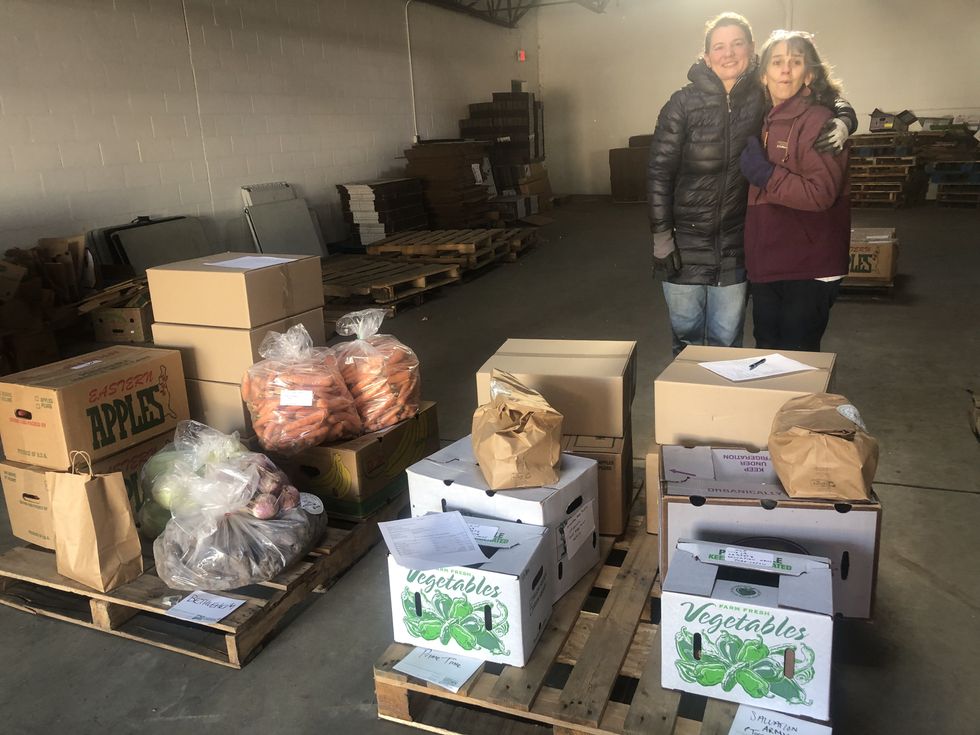 Northwest Connecticut Food Hub director Renee Giroux moving a pallet of regionally grown produce dropped off by farmers, aggregated, and prepared for outgoing delivery to food access organizations.