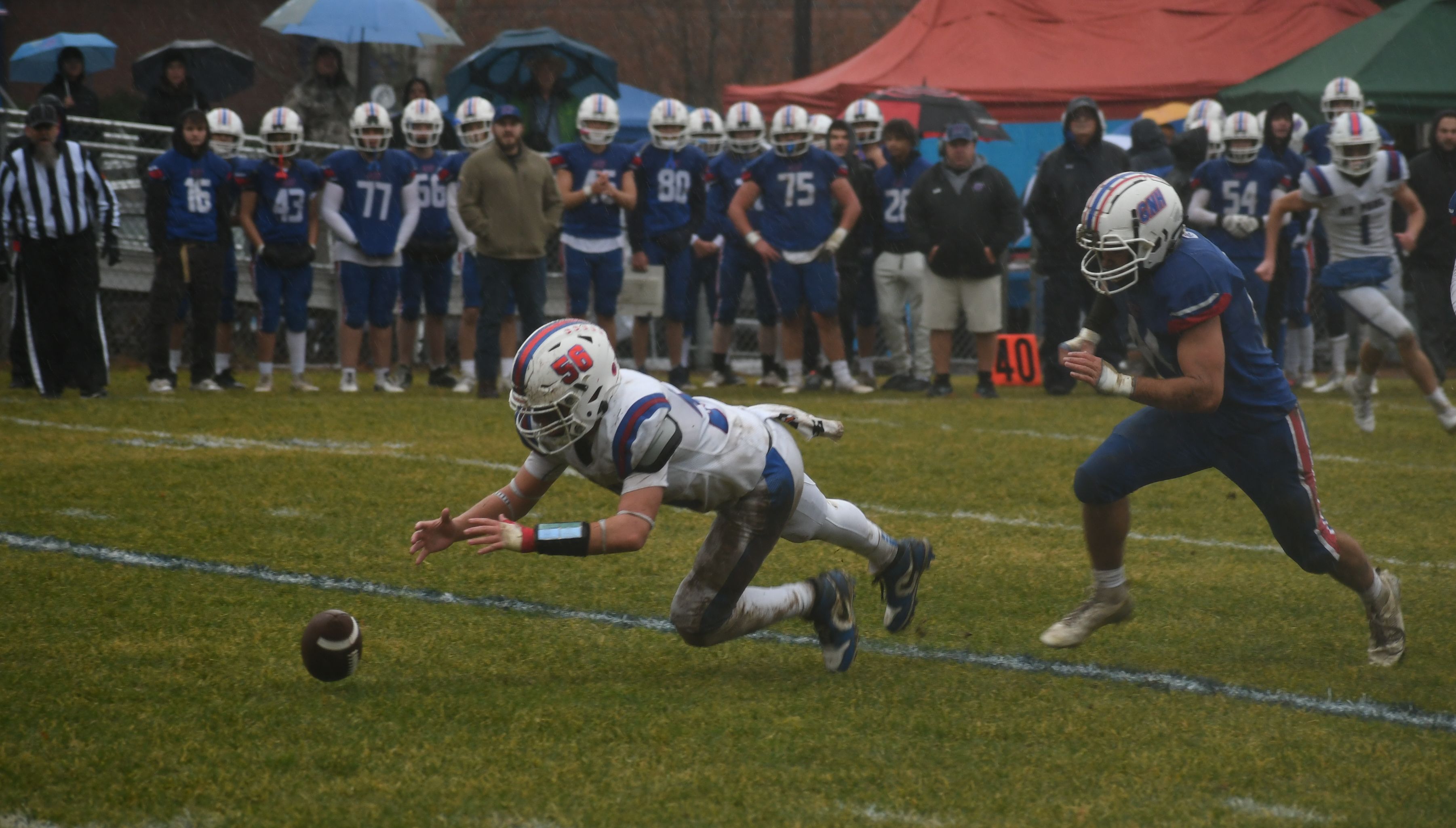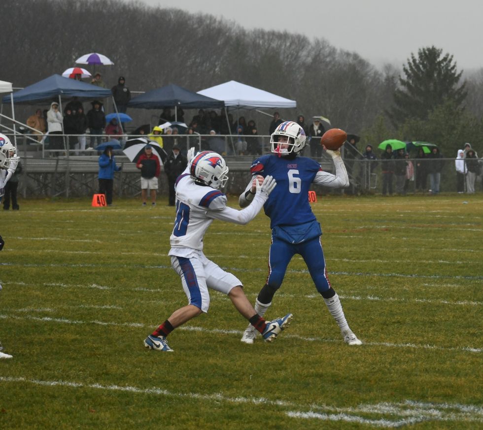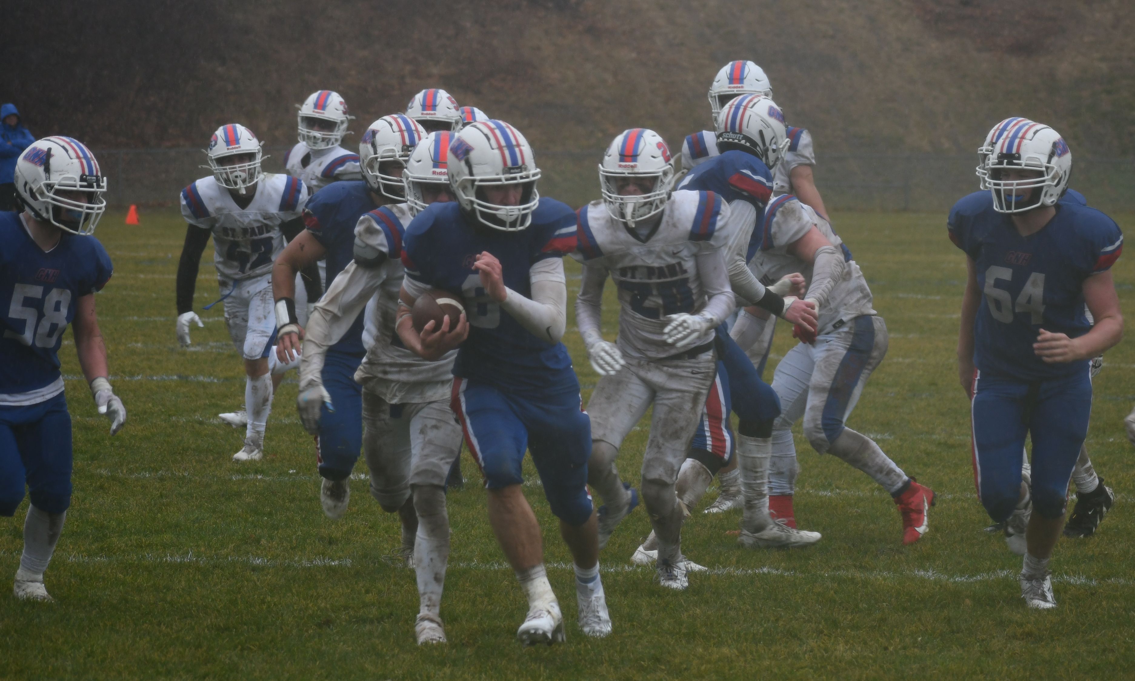 Cold, rainy conditions made for a ground and pound game with GNH scoring five rushing touchdowns. QB Owen Stimpson completed three passes, two of which were caught for long-distance touchdowns.