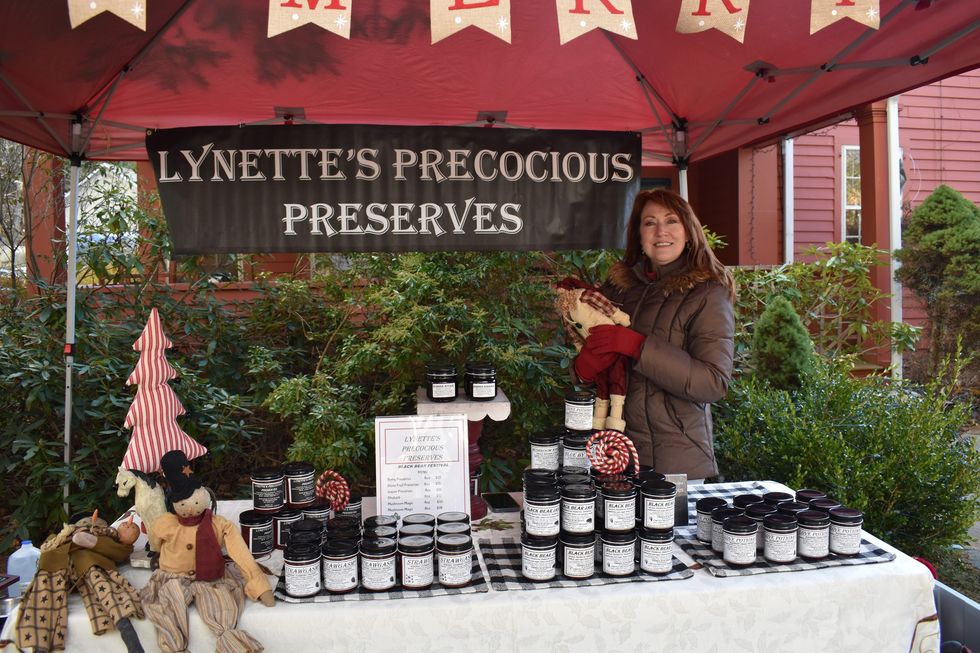 Michele Paladino, left, of “Lindera” had a display of wreaths and decorative arrangements. She gathers seeds from native plants and grows them to make her creations. On the right, Helena Barnes of Sharon Valley Honey had three kinds of honey: raw, whipped, and honey butter on sale. The honey comes from bees from her own hives in Sharon. They were at the West Cornwall Holiday Market on Nov. 30.
