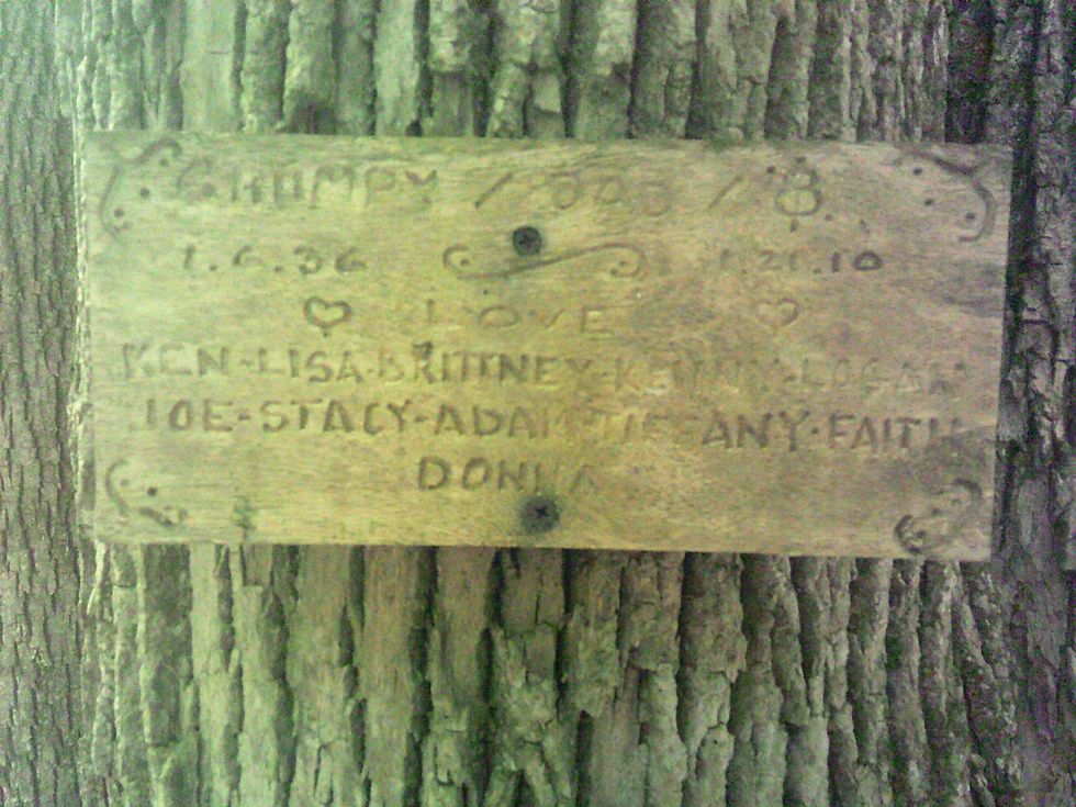 Affixed to a tree, and facing away from the stream, was a wooden plaque of sorts, a memorial to “Grumpy Dad.”