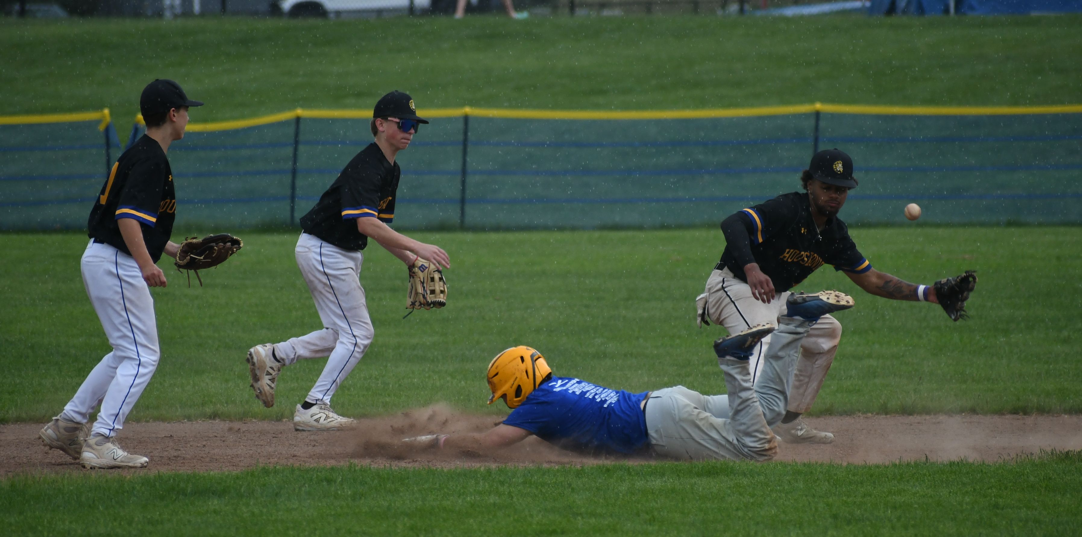Pete Foley, Class of 1988, extends for the ball as Chris Race, Class of 2027, slides into third base.