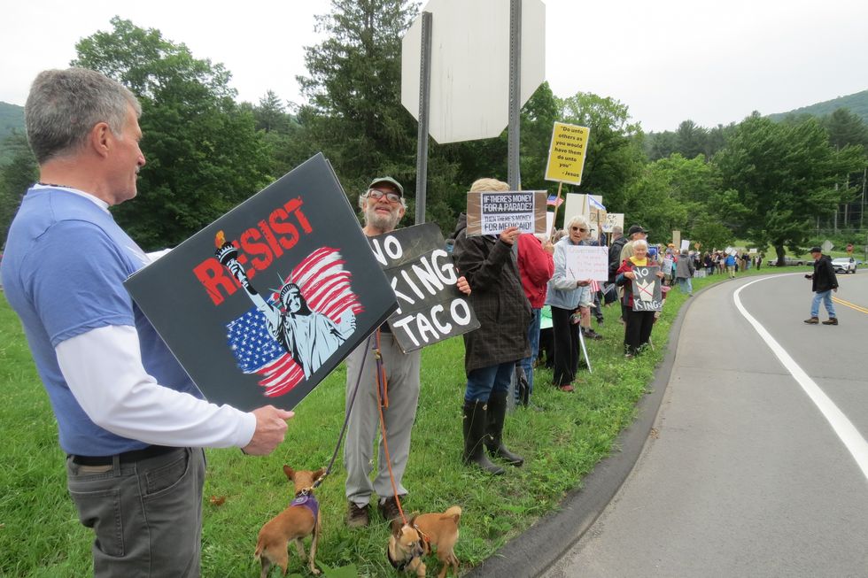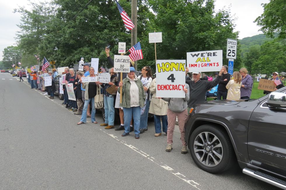 In Cornwall, Doug Craig, holding a huge sign of a crown being slashed, said he’s mainly concerned that Trump’s big bill “has too many hidden things.” Paul Bacsik of Sharon said, “We need co-branches of government, not one.”