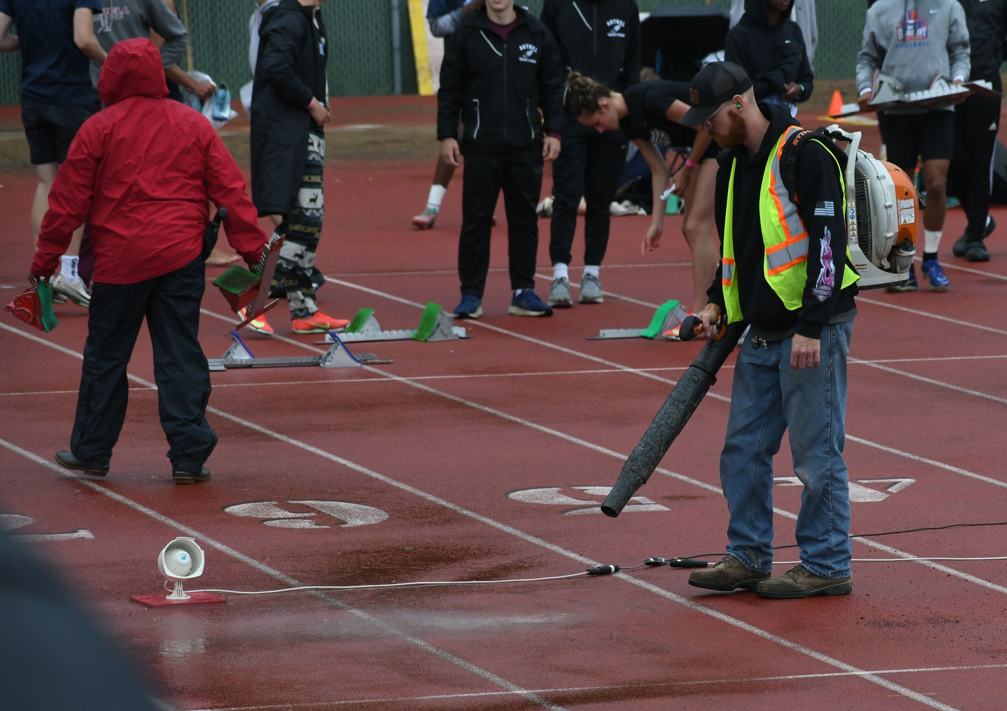 Rain came down heavy in the morning June 14, but conditions improved as the day went on. The crew used leaf blowers to dry the track between events.Photo by Riley Klein