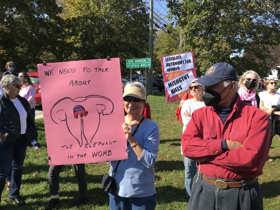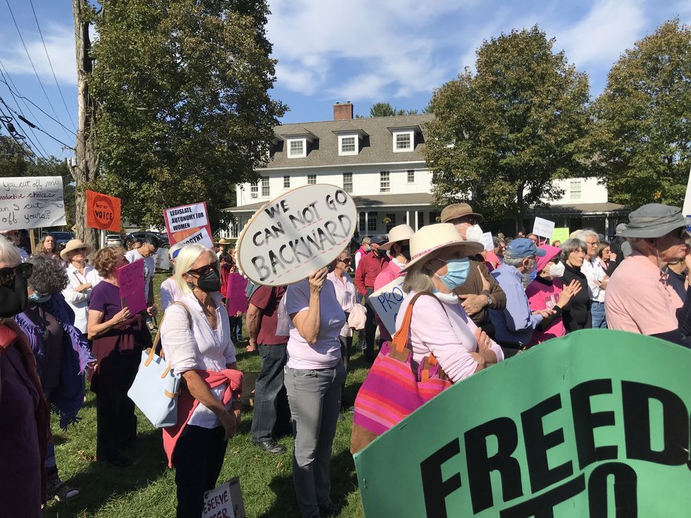 In Salisbury, where the event began at 2 p.m., more than 150 people met on the green at The White Hart and held signs with messages about women “controlling their own bodies.” They heard from multiple speakers, including state Rep. Maria Horn (D-64), who said, “This is about the women who can’t be here, and it’s incumbent on those here to stand up for them. If Roe goes away, it will not stop abortion, just safe, legal abortion.”