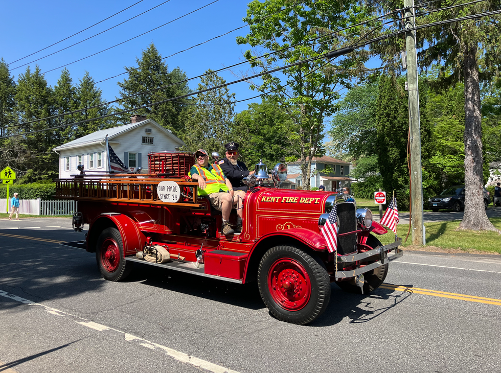 Antique vehicles and trucks from the Kent Volunteer Fire Department donned American flags as they took their place in the lineup, along with Boy Scouts from local troops and members of the Kent Lions Club.