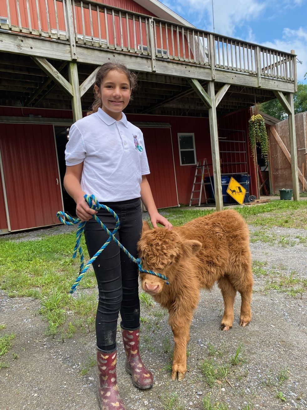 Phoebe Archer, 11, of Elk Ravine Farm in Amenia, lets newborn Scottish Highland calf Charlie have a controlled romp on the occasion of his sixth week of life to the day on Saturday, July 10. The previous weekend, Charlie had charmed onlookers at the Highland Games at Lime Rock Park. Photo by Leila Hawken