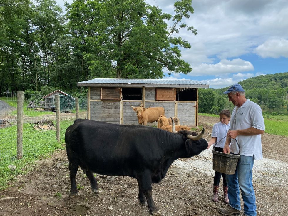 Phoebe Archer, 11, is happy to help her dad, James Archer, at right, in caring for the Highland cattle housed at Elk Ravine Farm in Amenia. They paused for a photo on Saturday, July 10. Photo by Leila Hawken