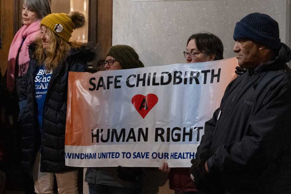 Activists stood on the steps of the state Capitol on November 13, 2023, to protest the proposed closure of the labor and delivery unit at Windham Hospital.