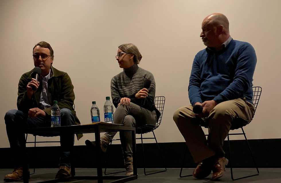 From left, Justin Potter, president of Kent Affordable Housing; Jocelyn Ayer, director of the Litchfield County Center for Housing Opportunity; and Sean Ghio, policy director of the Partnership for Strong Communities in Connecticut, discussed the film “Housing Our Neighbors” on Wednesday, Nov. 9, at The Moviehouse in Millerton. Photo by Leila Hawken