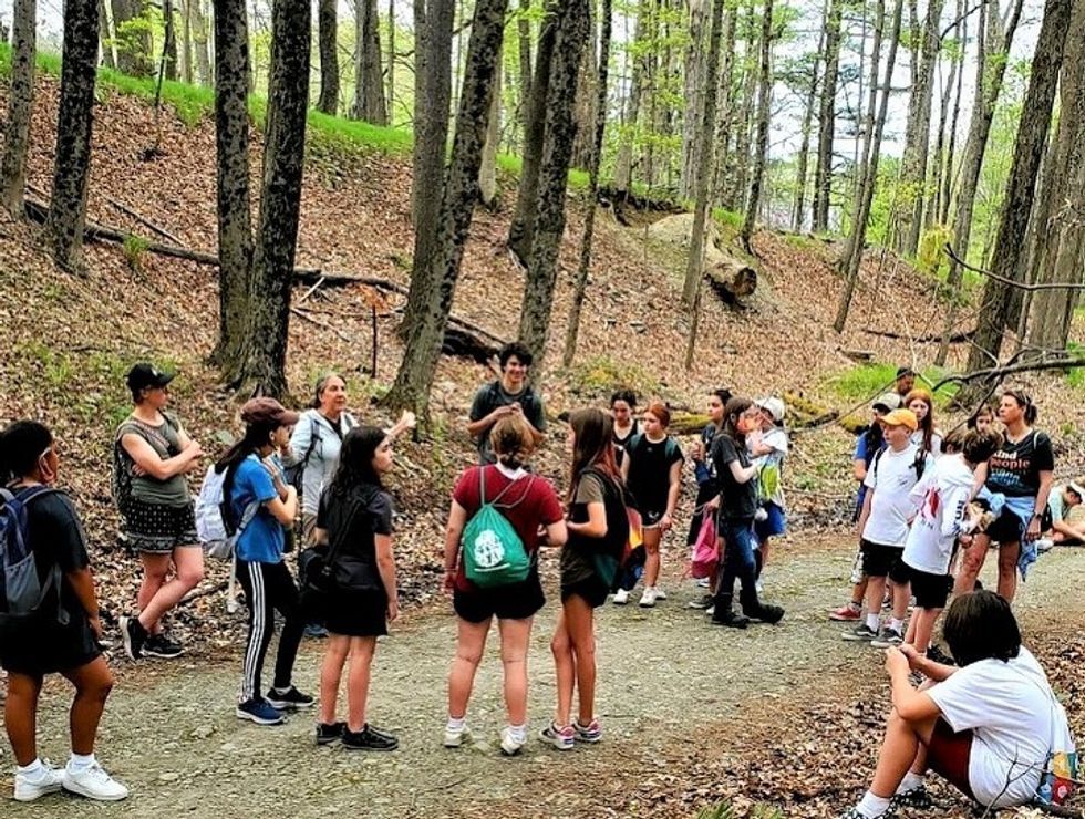 Paul Singer of the Housatonic Valley Association and Diane Fitzmeyer Murphy of the Salisbury Association guided children from Salisbury Central School on a field trip earlier this year focused on habitat connectivity and wildlife corridors. Photo Submitted
