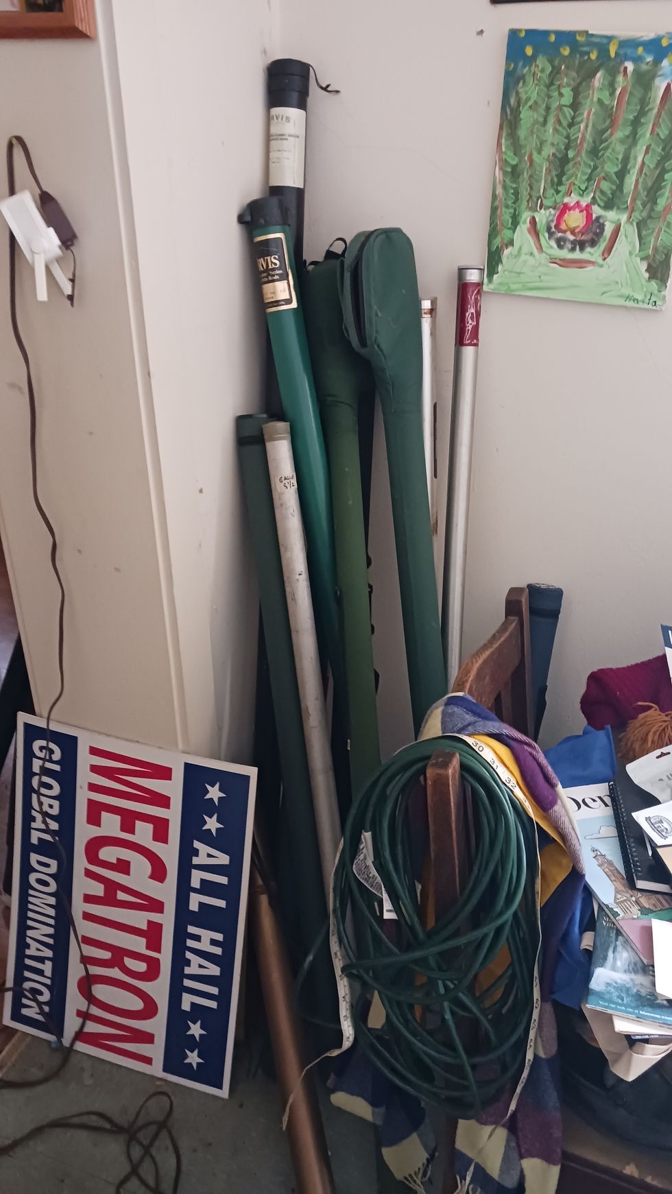 The rods that don’t fit in the Fish Closet make it difficult to access the fishing books. Photo by Patrick L. Sullivan