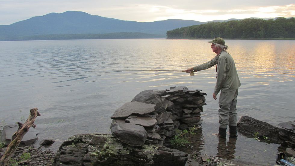 With rising temps in mind, we tried for smallies from the shore at the Ashokan Reservoir. We caught panfish on what Gary calls “Mr. Wiggly,” which is any kind of Chernobyl-type foam terrestrial fly, but of bronzebacks we saw nothing. We also encountered the wraith of John Burroughs, if John Burroughs liked to tool around with a savage dog barely restrained by what appeared to me to be a completely inadequate leash.