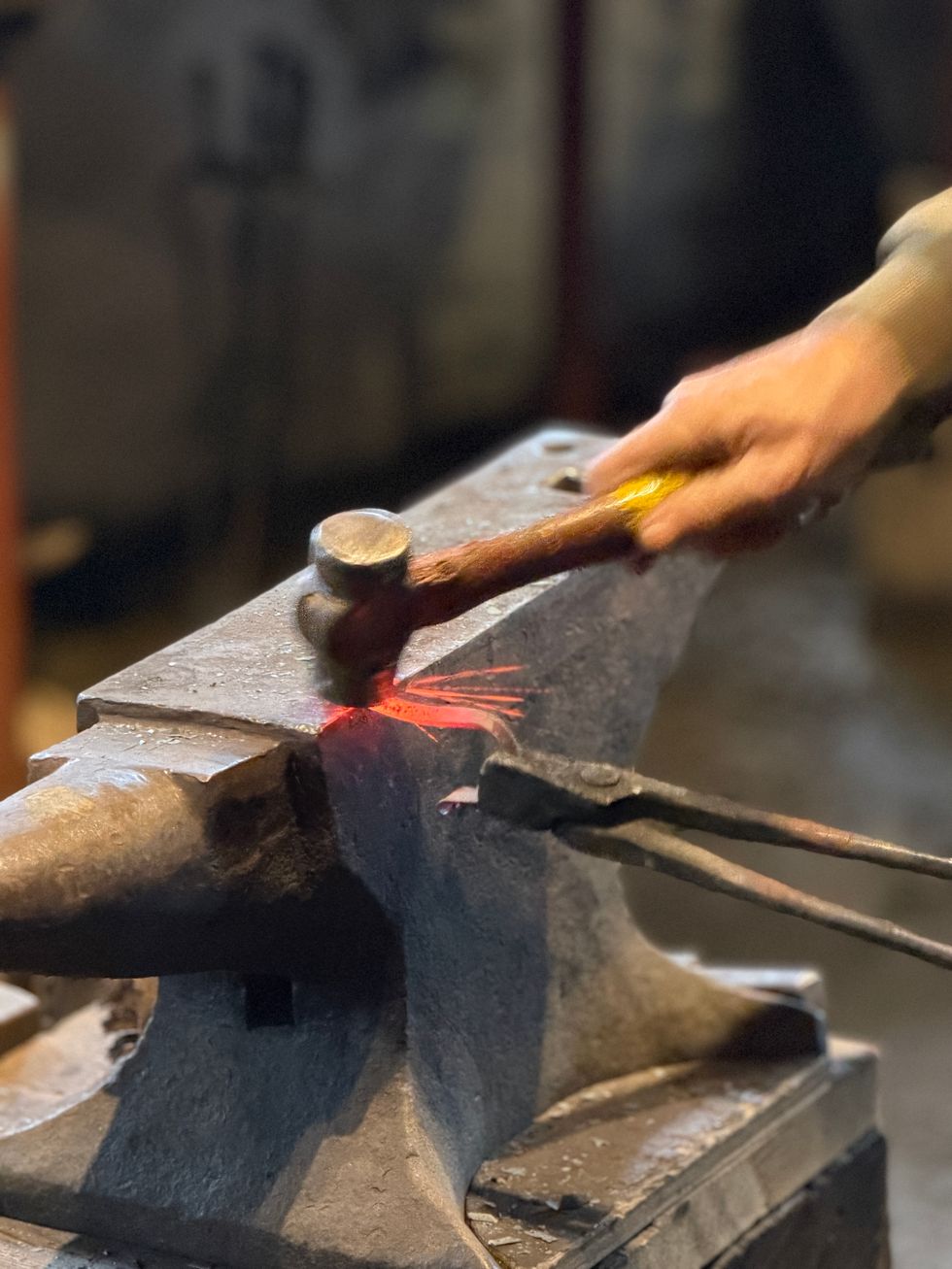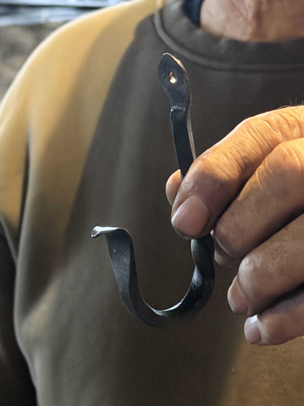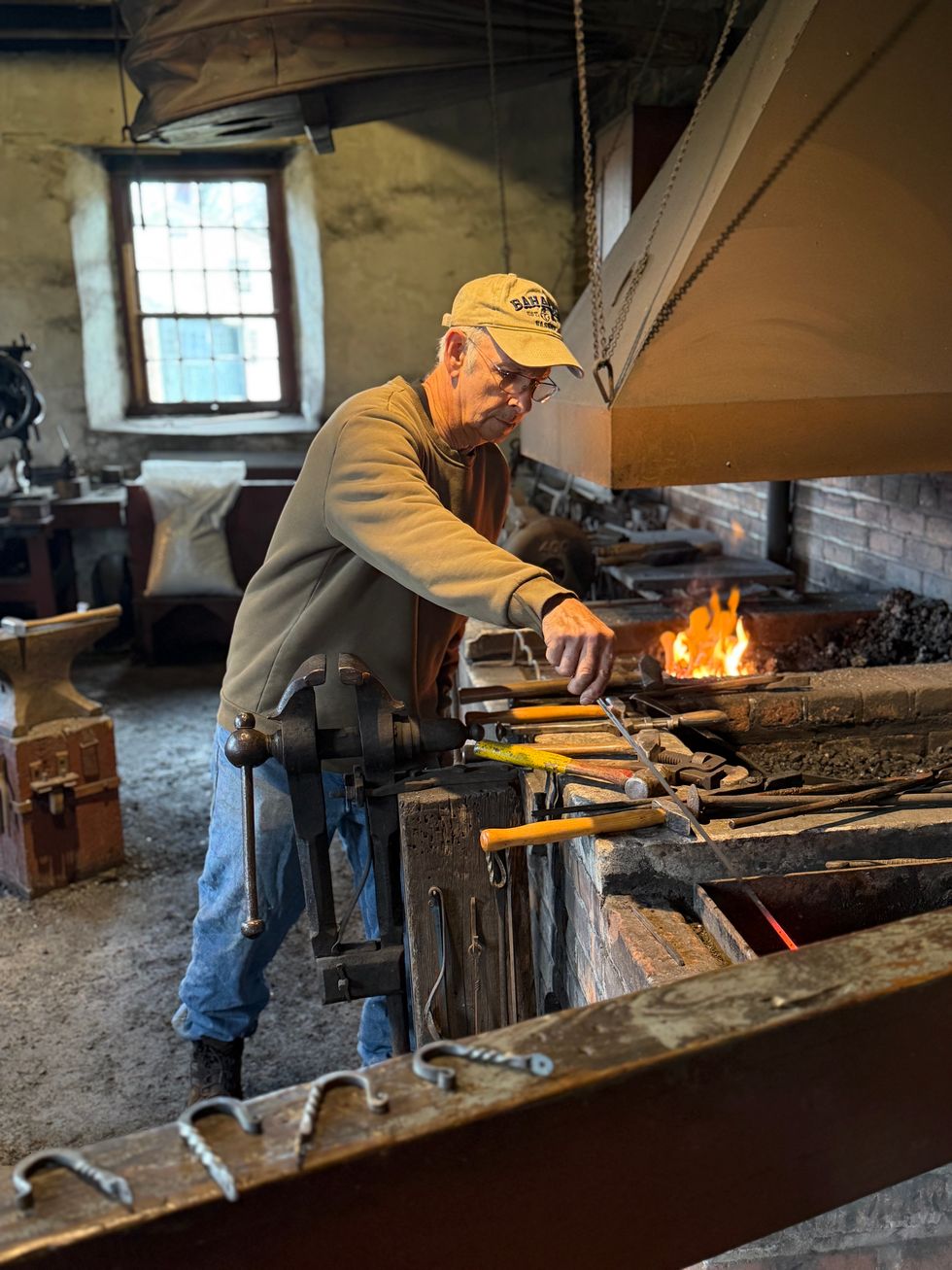 Burning coal smelled acrid as the blacksmith fired up his stove to heat the metal rod he was transforming into a hook. Hammer on anvil is an ancient sound. My husband has blacksmithing skills and once made the strap hinges and thumb latches for a friend’s home.