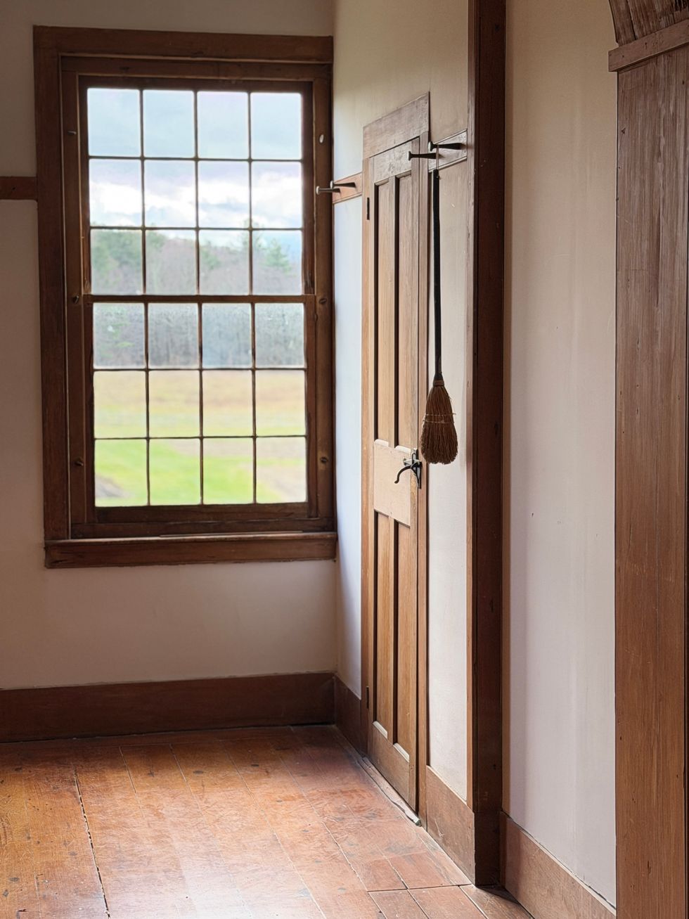 My husband Tom, our friend Jim Jasper and I spent the day at Hancock Shaker Village in Pittsfield, Massachusetts. A cold, blustery wind shook the limbs of an ancient apple tree still clinging to golden fruit. Spitting sleet drove us inside for warmth, and the lusty smells of manure from the goats, sheep, pigs and chickens in the Stone Round Barn filled our senses. We traveled back in time down sparse hallways lined with endless peg racks. The winter light was slightly crooked through the panes of old glass. The quiet life of the Shakers is preserved simply.