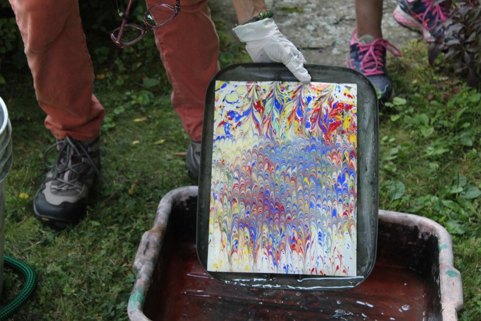 In fact, Di Marco came to the Button Garden outside the library, as paper marbling can get messy.
