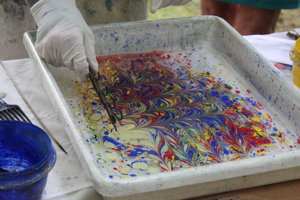 Chistina DiMarco prepares the paint for marbling at Scoville Memorial Library, July 28.