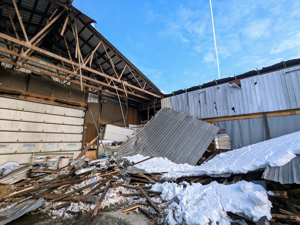 Heavy snow caused the roof of David Jacquier’s barn early Wednesday morning, March 15. Photo by Riley Klein