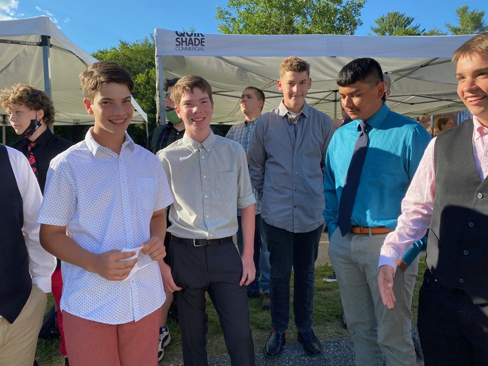 Getting ready to line up for the North Canaan Elementary School procession to their promotion ceremony, students gathered under a tent to wish each other well and remember the good times. Photo by Leila Hawken