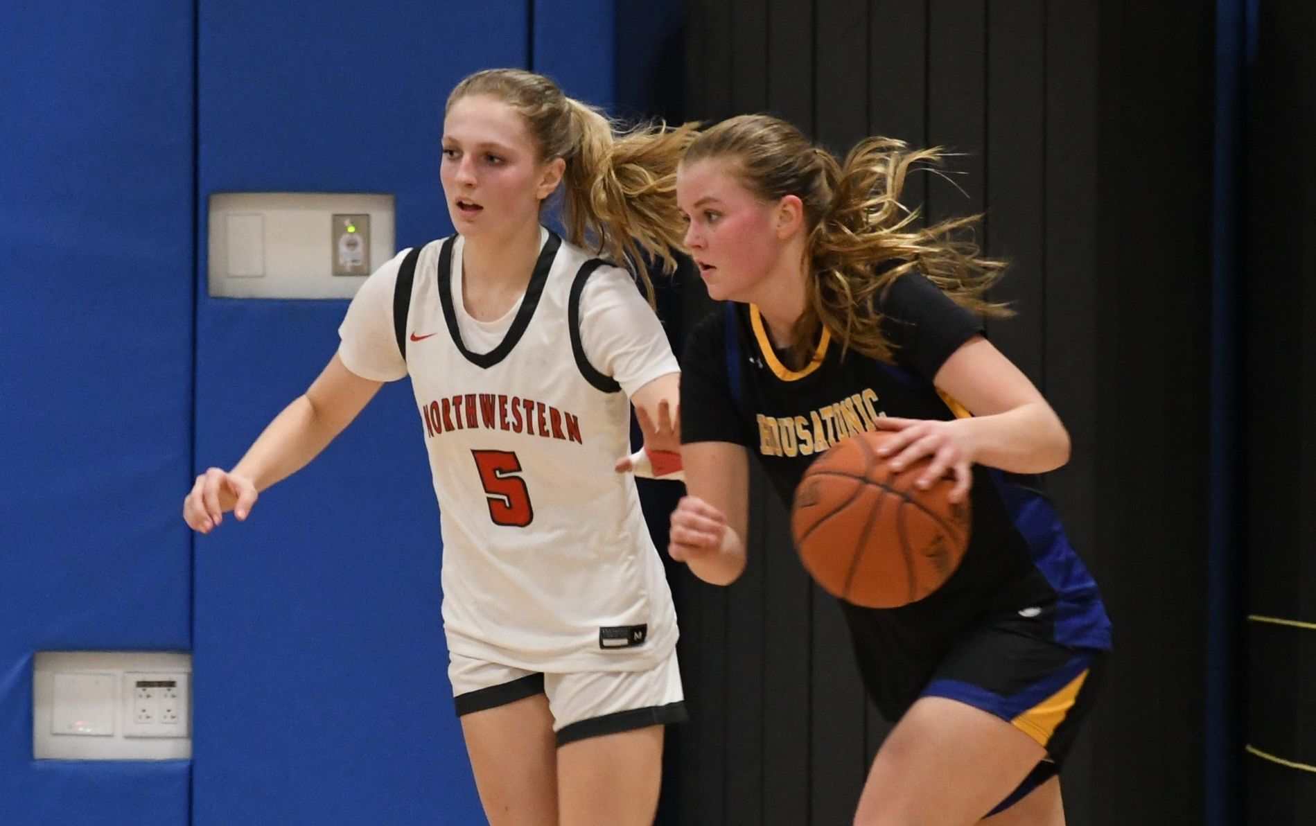 Northwestern star Maddie Topa defends Housatonic's Olivia Brooks in the Berkshire League semifinal Feb. 21.