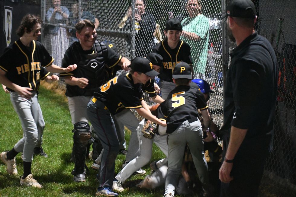 With two on in the bottom of the fifth, Ohler launched a deep double and brought home Thomas Nichols. With the lead at 10 runs, the game ended by run rule and the Pirates piled up in the infield.