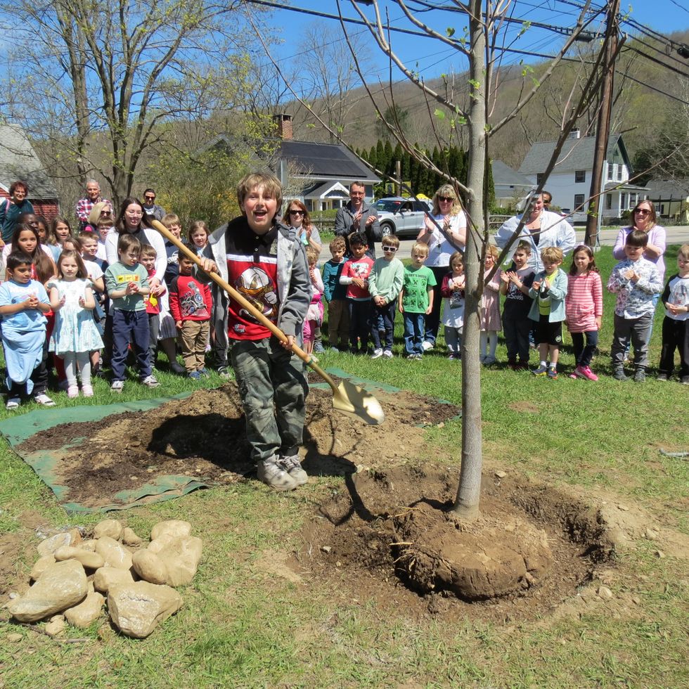 In North Canaan, Tom Zetterstrom and Christian Allyn oversaw the planting of a young American linden tree. This marked the 34th annual Arbor Day ceremony in North Canaan Elementary School’s arboretum.