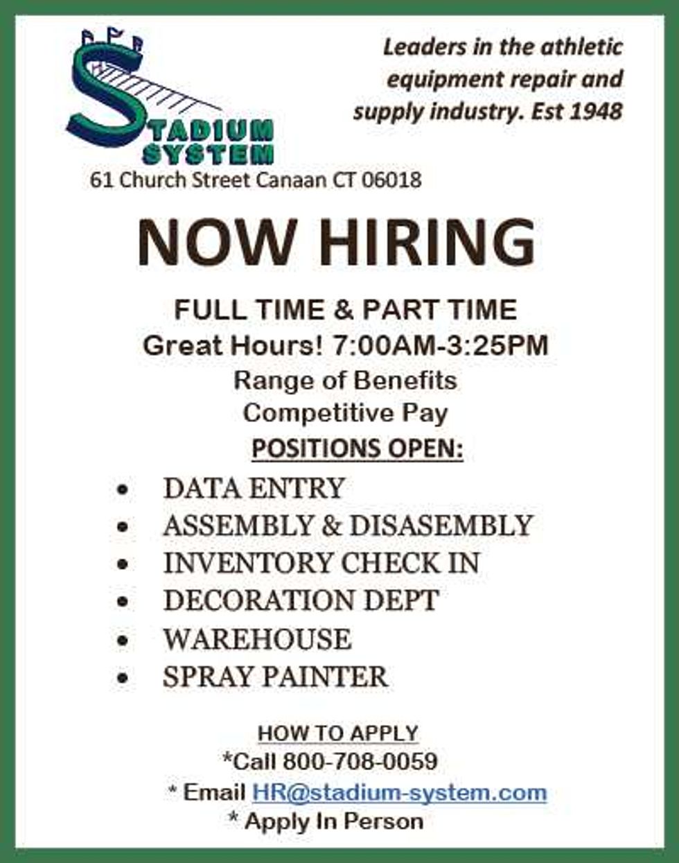 Weatogue Stables in Salisbury, CT: has an opening for experienced barn help for Mondays and Tuesdays. More hours available if desired. Reliable and experienced please! All daily aspects of farm care- feeding, grooming, turnout/in, stall/barn/pasture cleaning. Possible housing available for a full-time applicant. Lovely facility, great staff and horses! Contact Bobbi at 860-307-8531. Text best for prompt reply.