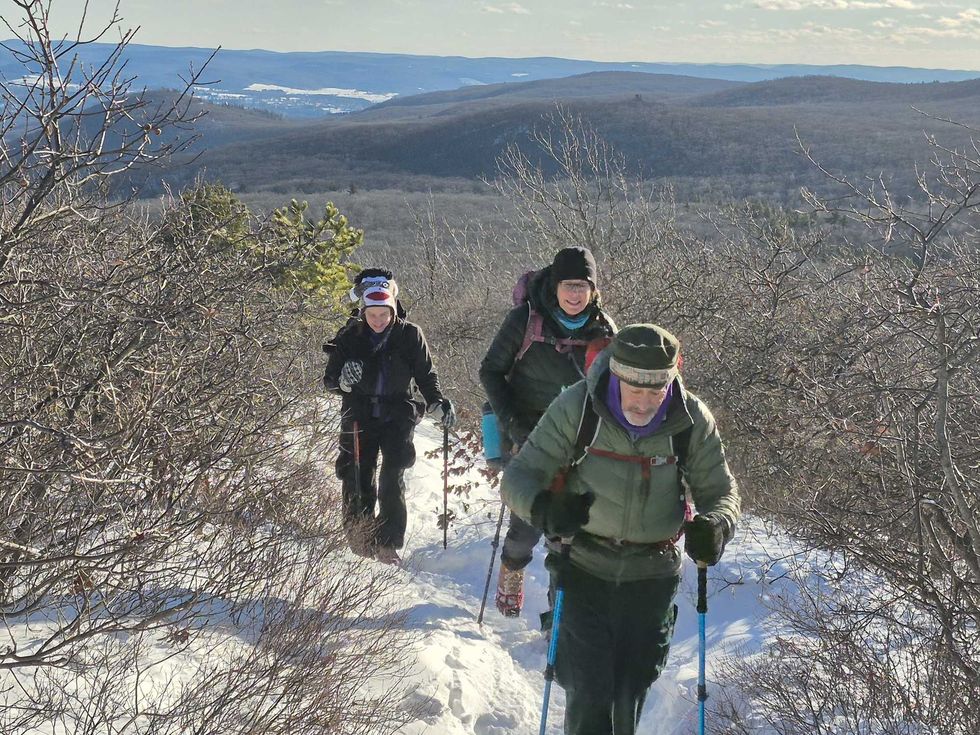 Walter and her friend, Linda Huebner, of Halifax, Vermont, joined Blumert for his milestone hike on New Year’s Day. With 4 inches of snow having fallen the night before, they set foot shortly after noon and reached the top just before 3 p.m. The trek back down took half that time.